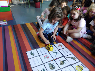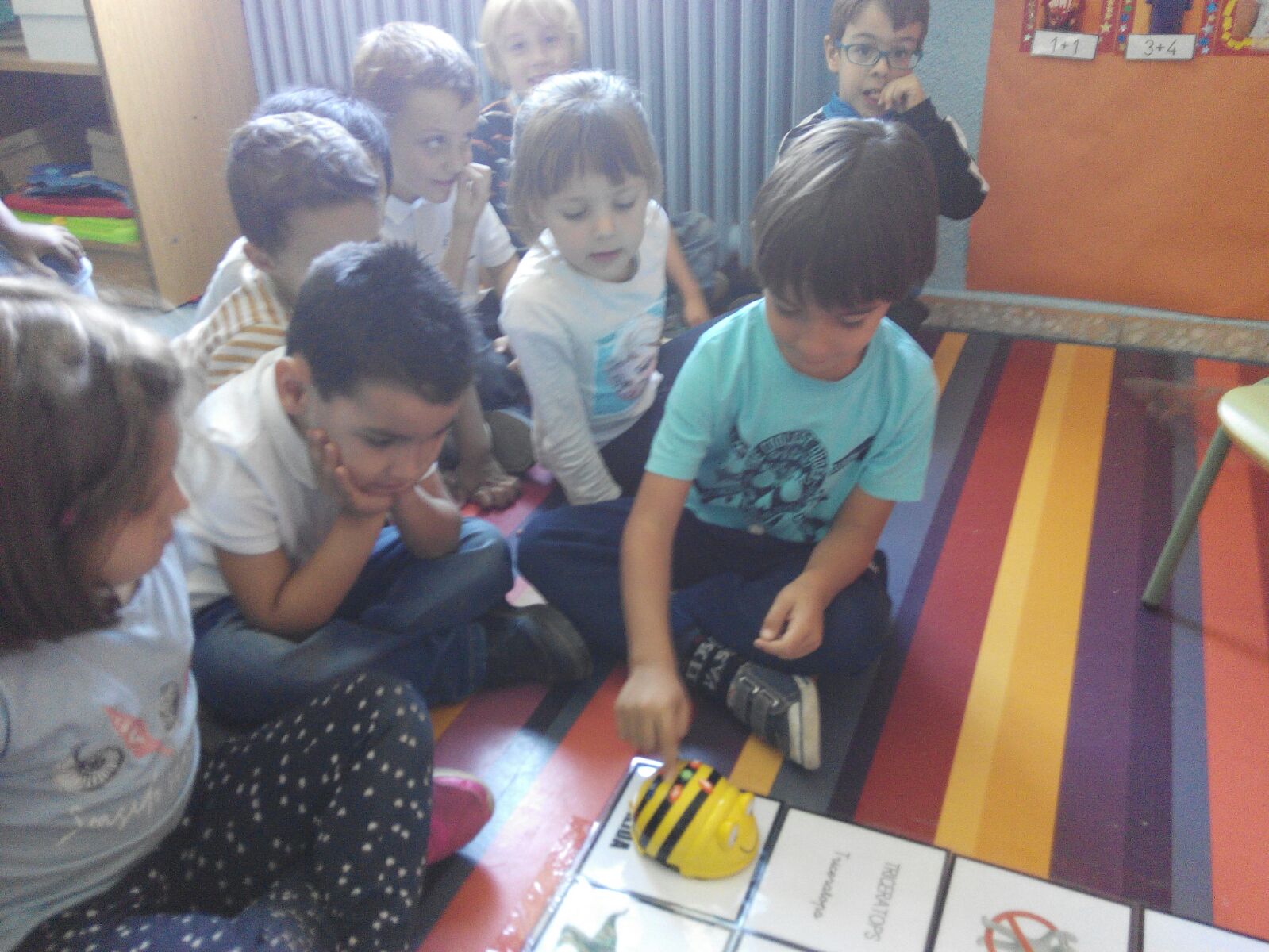 Beebot ha recorrido las casillas buscando al dinosaurio y su nombre, trabajando así no sólo la Inteligencia visual-espacial, sino también la lectoescritura. La única regla era no atravesar por las casillas de prohibido.